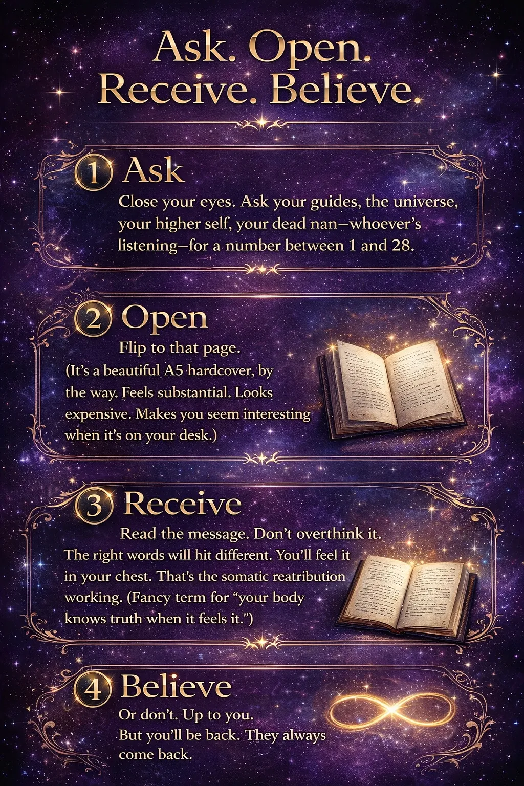 Whatever number drops into your mind - You open the book.